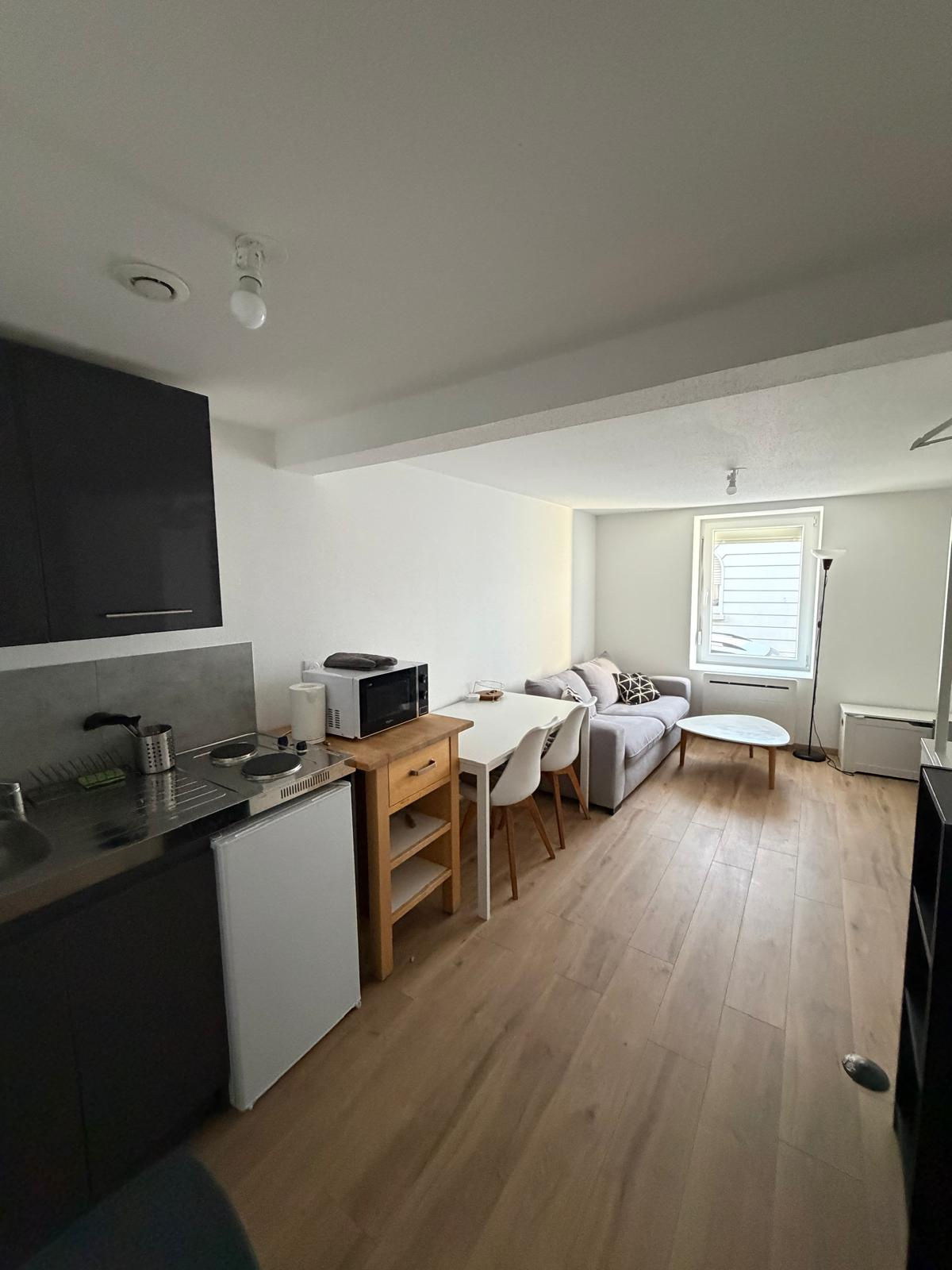 Adresse : Rue du Rossberg, 68200 Mulhouse Référence dossier : 16ROSSBERG STUDIO Situé dans une ruelle calme, à proximité immédiate du centre-ville de Mulhouse, ce studio meublé de 22 m2 offre un cadre de vie moderne, fonctionnel et prêt à habiter. Description du logement Ce studio lumineux se compose de : Une pièce de vie aménagée avec canapé, table, chaises et rangements Un coin cuisine équipé (plaques, réfrigérateur, micro-ondes, rangements) Une salle d’eau avec douche, lavabo et WC Chauffage individuel Mobilier complet permettant une installation immédiate Idéal pour étudiant(e), jeune actif(ve) ou personne seule recherchant proximité des commodités (transports, commerces, centre-ville). Conditions financières : Loyer : 350 € TTC / mois Charges : 40 € / mois Honoraires : 263€ Dépôt de garantie : 500€ Type : Studio meublé